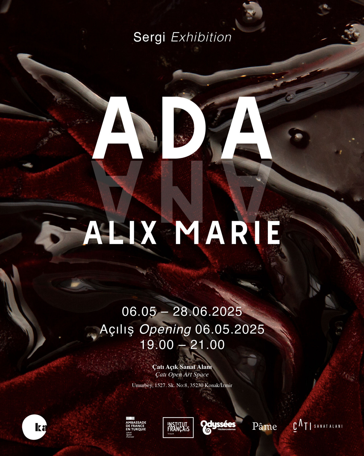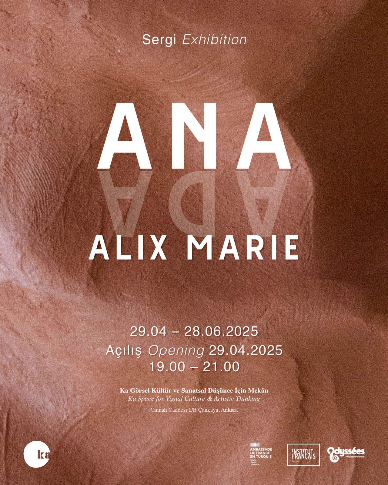 Invitée par Ka Görsel Kültür ve Sanatsal Düşünce İçin Mekân et avec le soutien de l’Institut Français de Turquie, Alix Marie présente Ana I Ada, sa première présentation majeure en Turquie. Se déroulant à Ankara et Izmir au printemps 2025, Ana sera exposée à Ka, un espace indépendant pour la culture visuelle, tandis qu’ Ada sera présentée à Çatı Açık Sanat Alanı.